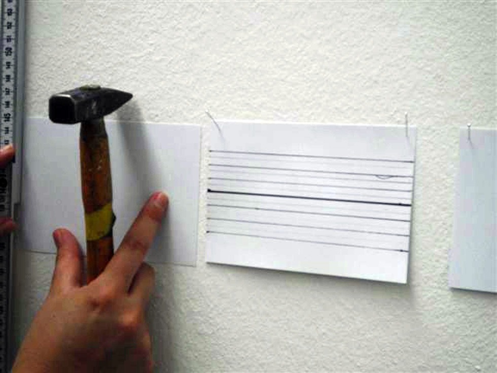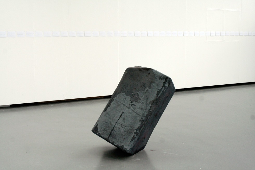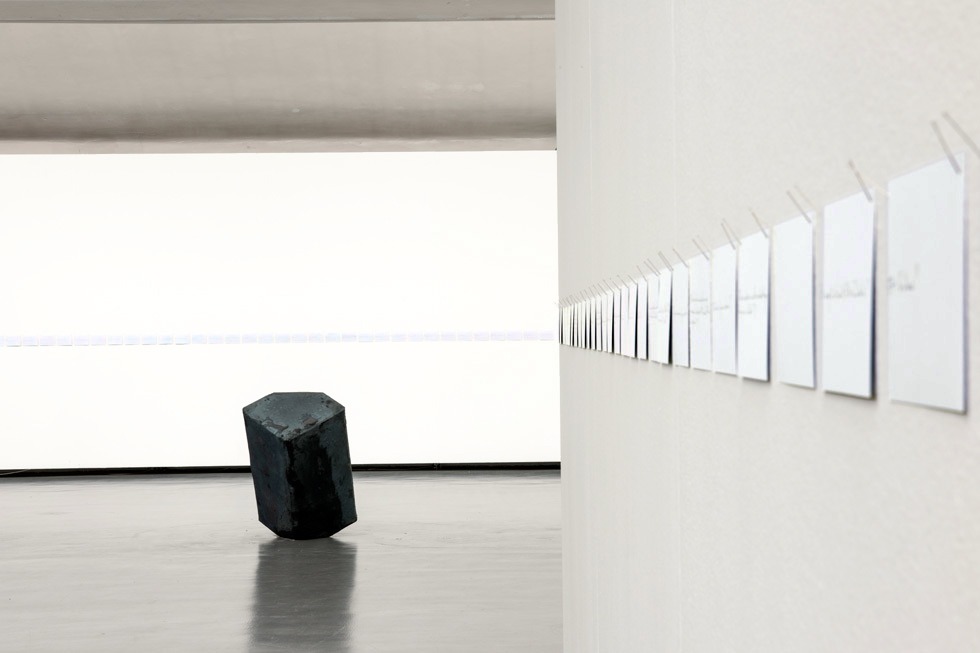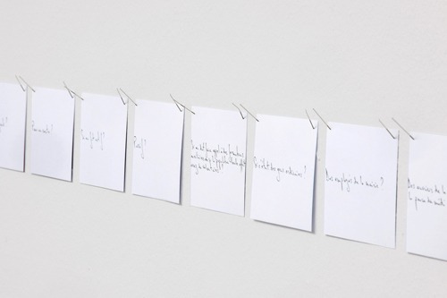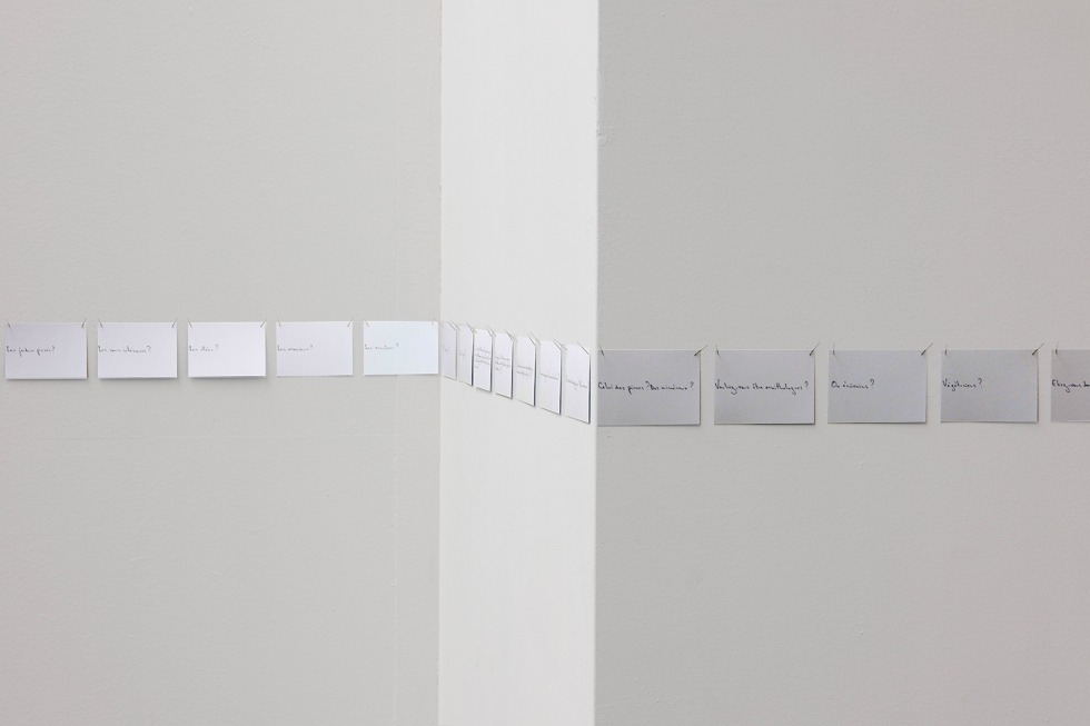 En écho aux ultimes missives jetées depuis les trains de déportation, j’ai écrit chacune des 524 questions de mon livre Nécessaire et urgent sur autant de fiches format carte postale, épinglées en une frise courant au-dessus des sculptures de Markus Strieder. Entre la compacité du métal forgé et la vulnérabilité des bristols, un dialogue s’établit à partir de cette définition que donne Kafka de la poésie : « Dichtung ist Verdichtung » / « La poésie est condensation ». « Dichtung und Verdichtung / Poésie et condensation » : exposition et catalogue, Kunsthalle Göppingen (Allemagne), juillet 2012.