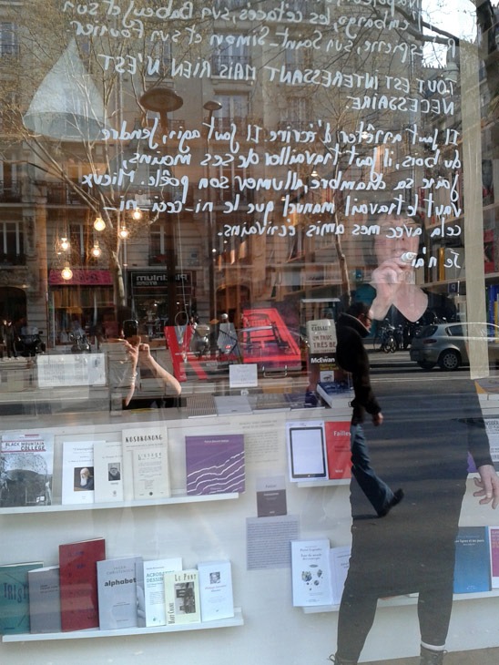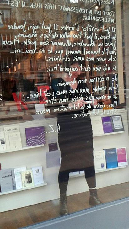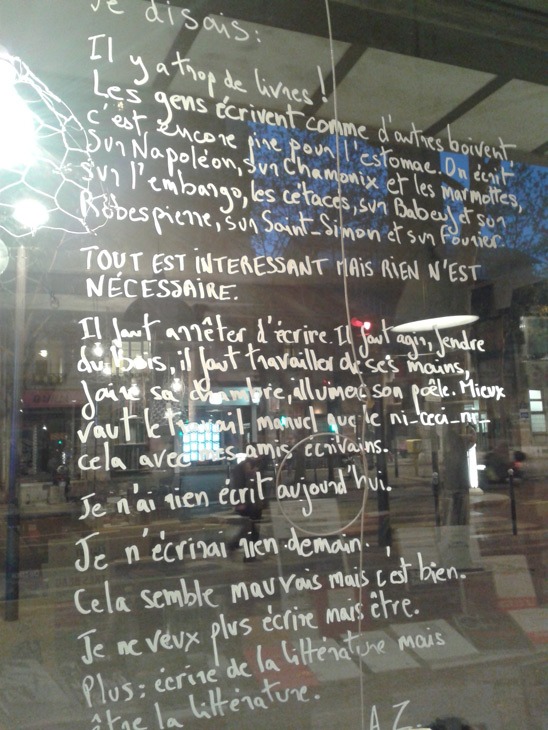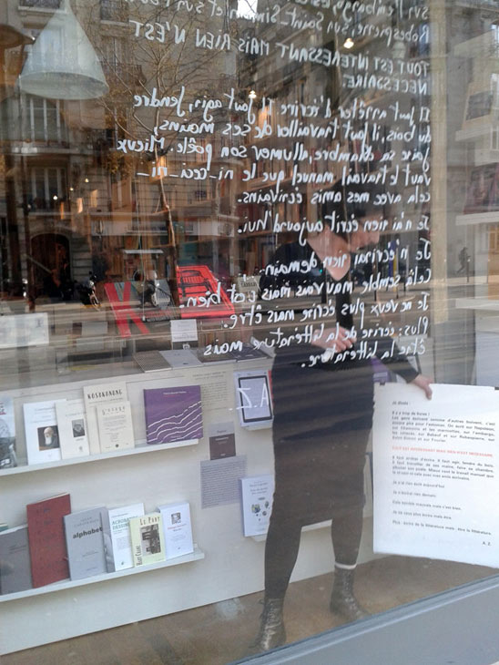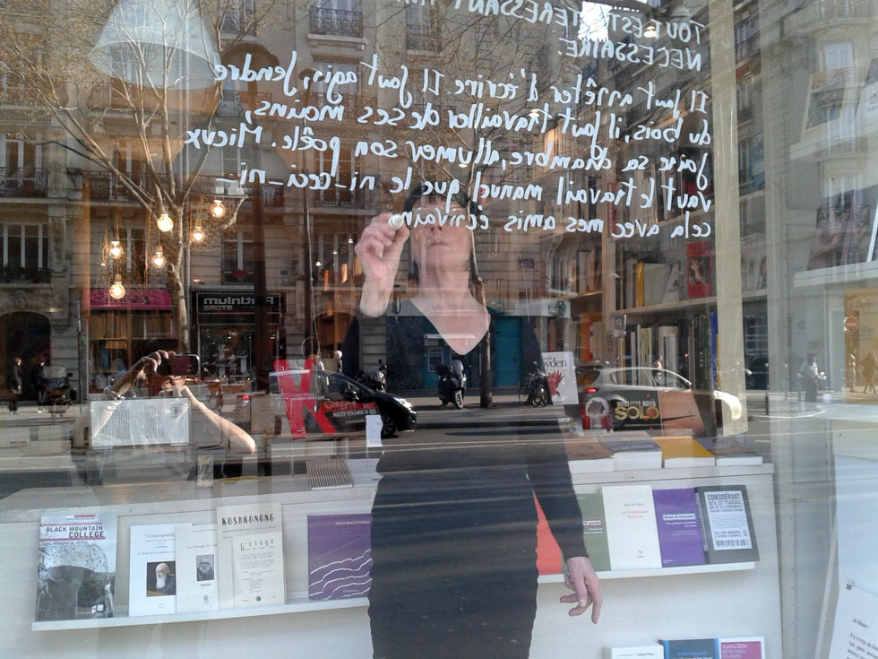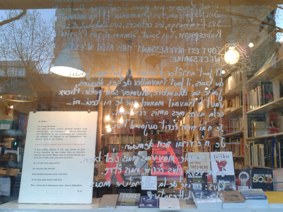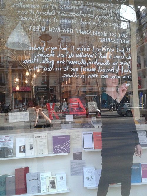 En 2015 et 2016, la librairie Texture me donnait carte blanche pour y organiser un cycle de rencontres avec des éditeurs, des auteurs, des traducteurs. Baptisé Les Gardiens des livres d’après l’ouvrage éponyme* des éditions Interférences, son but était de mettre en exergue le lien entre mon « être écrivain » et ce qui est bien d’avantage qu’un environnement culturel : un milieu nourricier vital participant d’une véritable écologie de la création. Écrit sur la vitrine de la Librairie Texture, 94 avenue Jean Jaurès, 75019 Paris, avril 2014