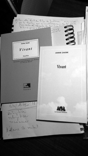 Annie Zadek leur tend des mots, concrets, extraits d’un quotidien méticuleux et dense. Sans doute n’apprécierait-elle pas que l’on dise que c’est un texte poétique, pourtant tout le chant sort d’un collage de mots puissants qui retiennent le temps. « Vivant » juste pour se le redire. Muriel Mayette, Administrateur de la Comédie Française, à l’occasion de sa mise en scène de « Vivant » à la Comédie Française, 2009